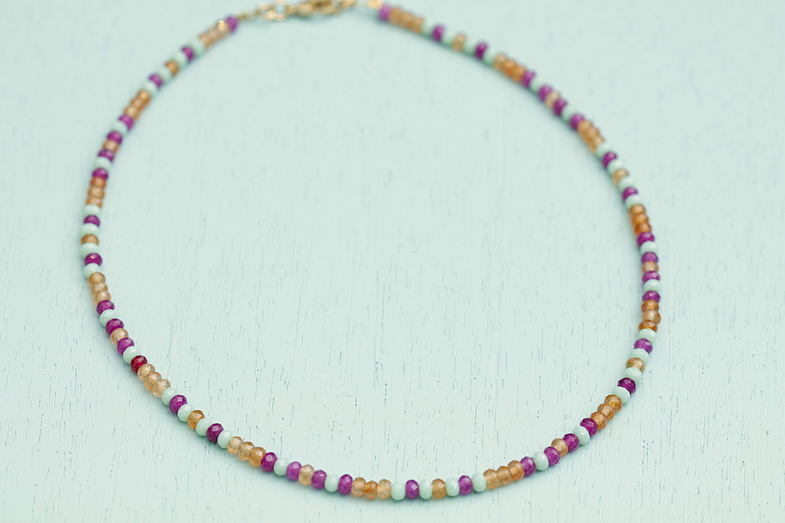 korte jade halsketting in donker framboos, munt en cognac
